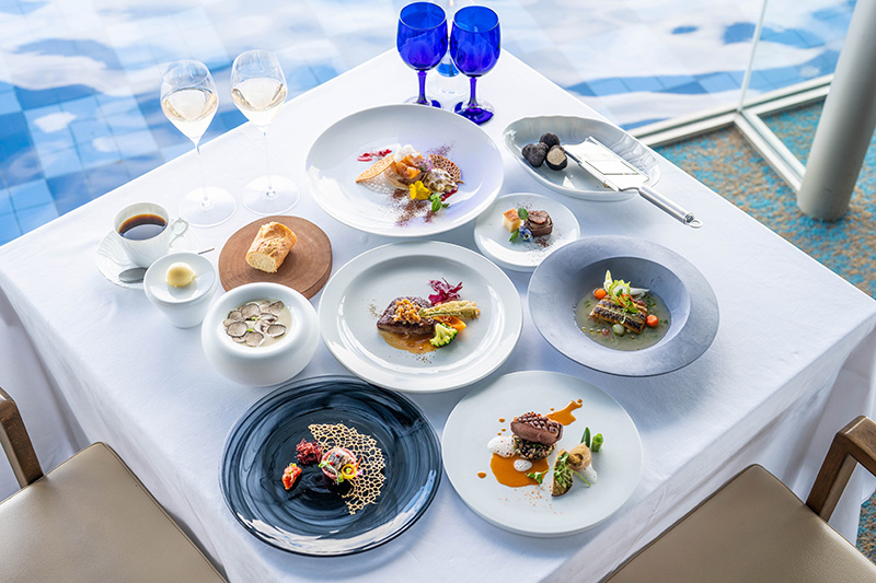 水上レストランにて、フレンチ・鉄板焼き・江戸前鮨から選べるディナーを、専門シェフが季節の厳選素材でコース仕立てに。朝食は和食もアメリカンブレックファストも、お部屋で優雅に。