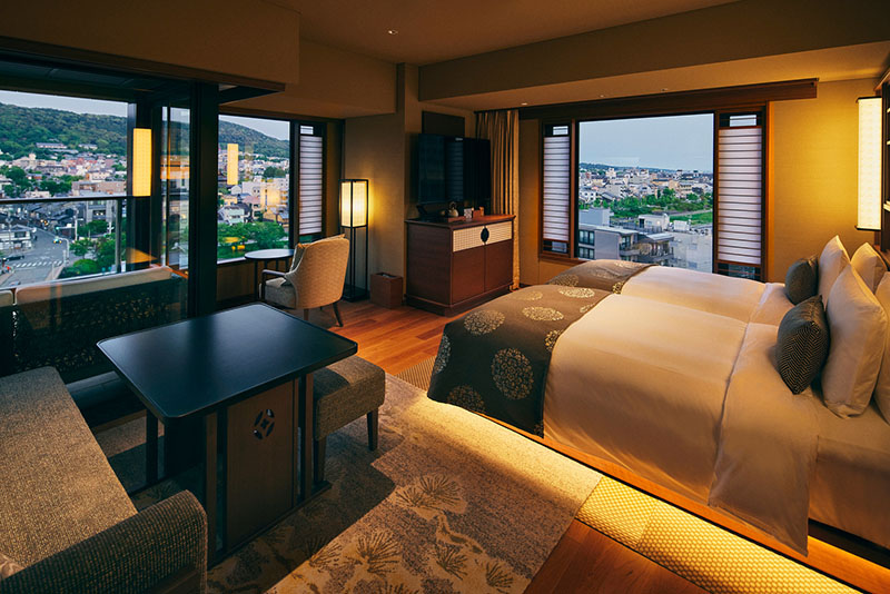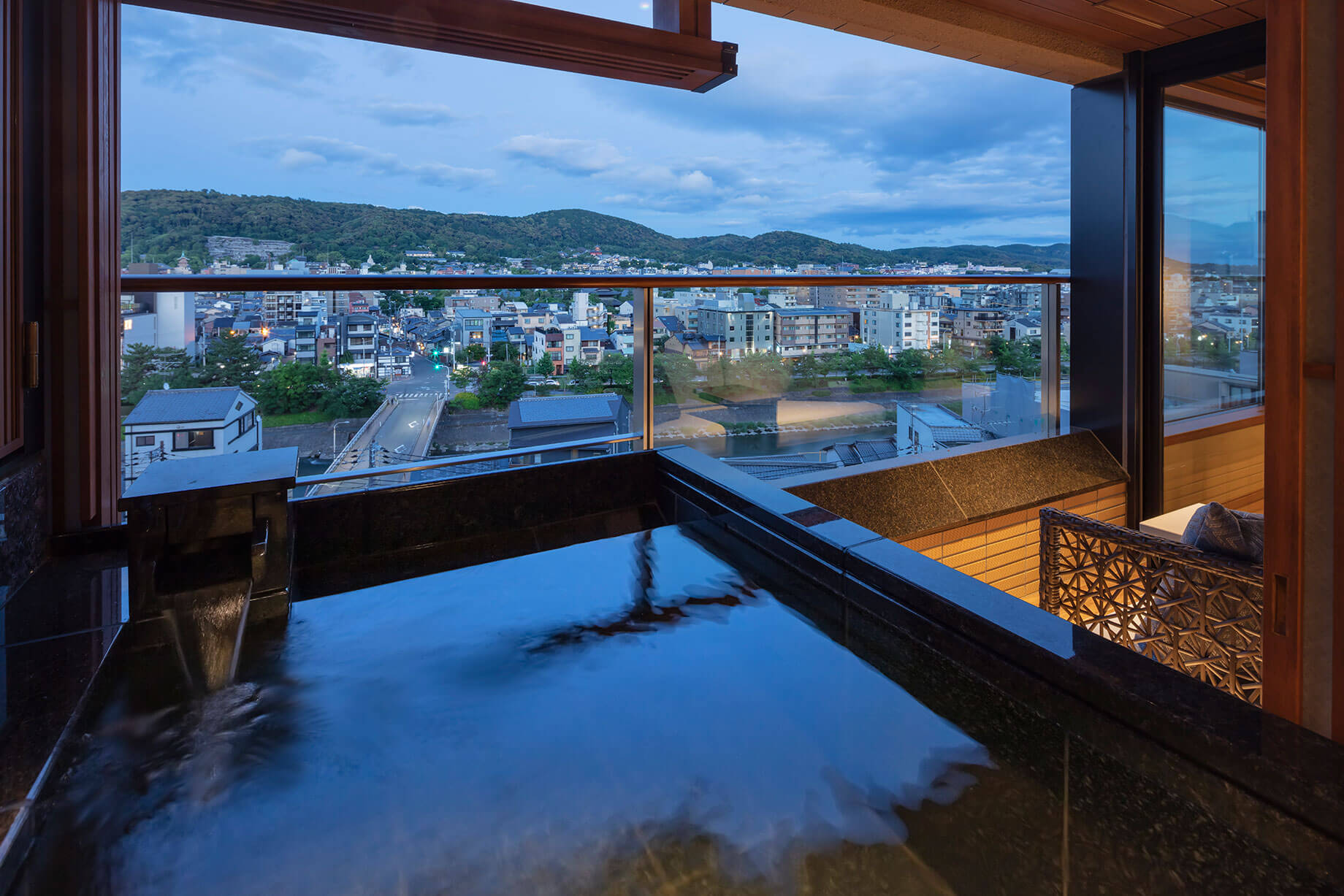 四条河原町交差点徒歩1分。京都中心部でありながら全室に自家源泉の露天風呂を備え、屋上テラスと東山の景観が織りなす唯一無二の滞在体験を。