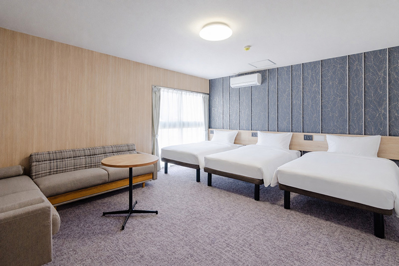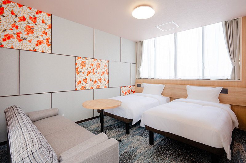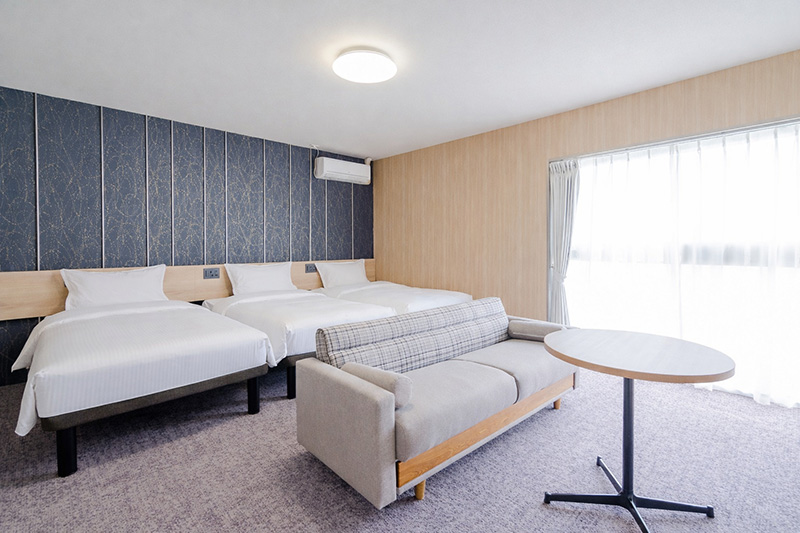 ツインを中心に最大5名まで対応する客室を用意。サータ製ベッドやスマートテレビを備え、家族やグループでも快適に過ごせる設計。テーブル、またはデスクも備え、用途に応じた滞在が可能です。