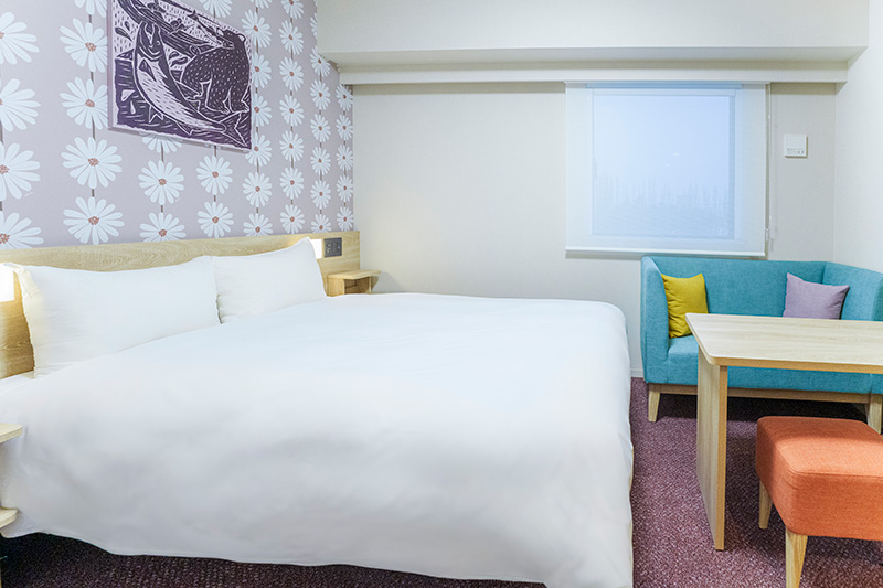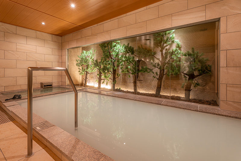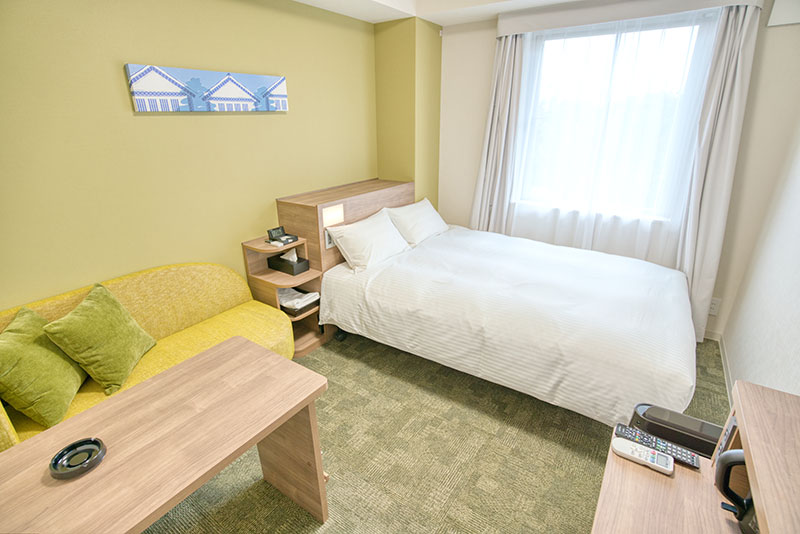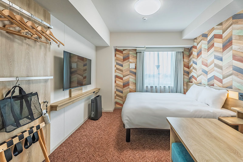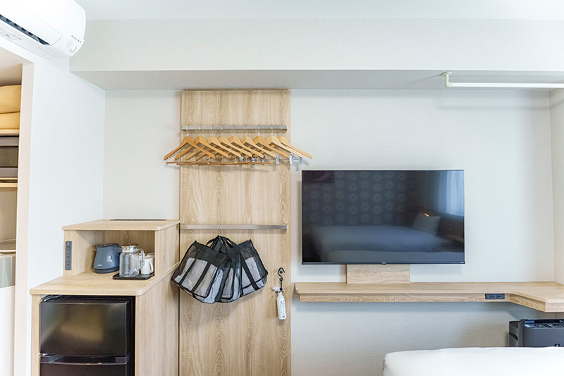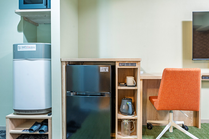 24㎡以上のゆったりとした客室には、広々としたデスクにチェア、空気清浄機、冷蔵庫など必要な設備が整っており、ビジネス・観光いずれの滞在にも快適です。館内にはトゴール薬石を用いた人工温泉「招き湯」の大浴場を完備し、旅の疲れを癒すことができ、また、アットホームな湯上り処には、無料のマッサージチェアもご用意しています。